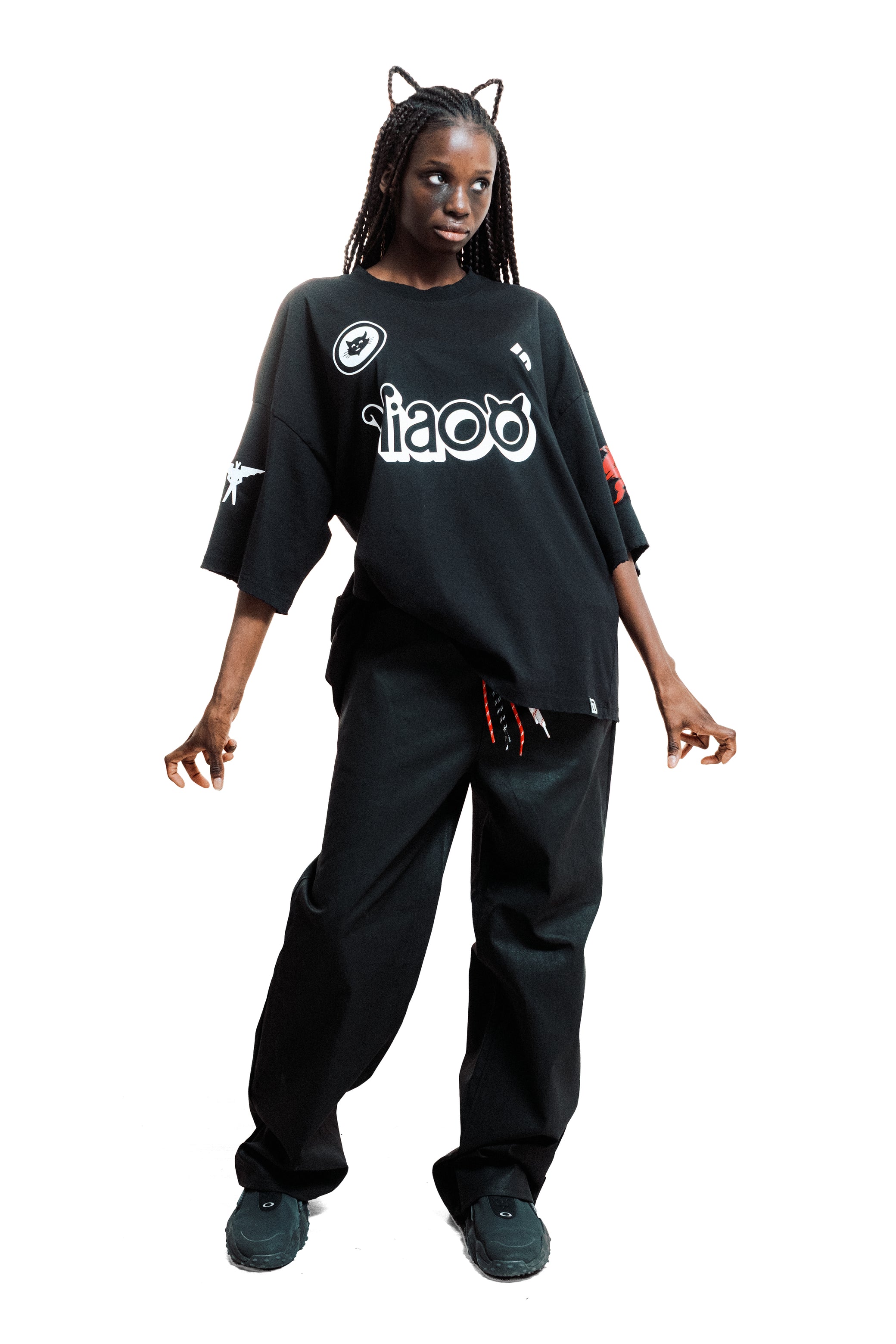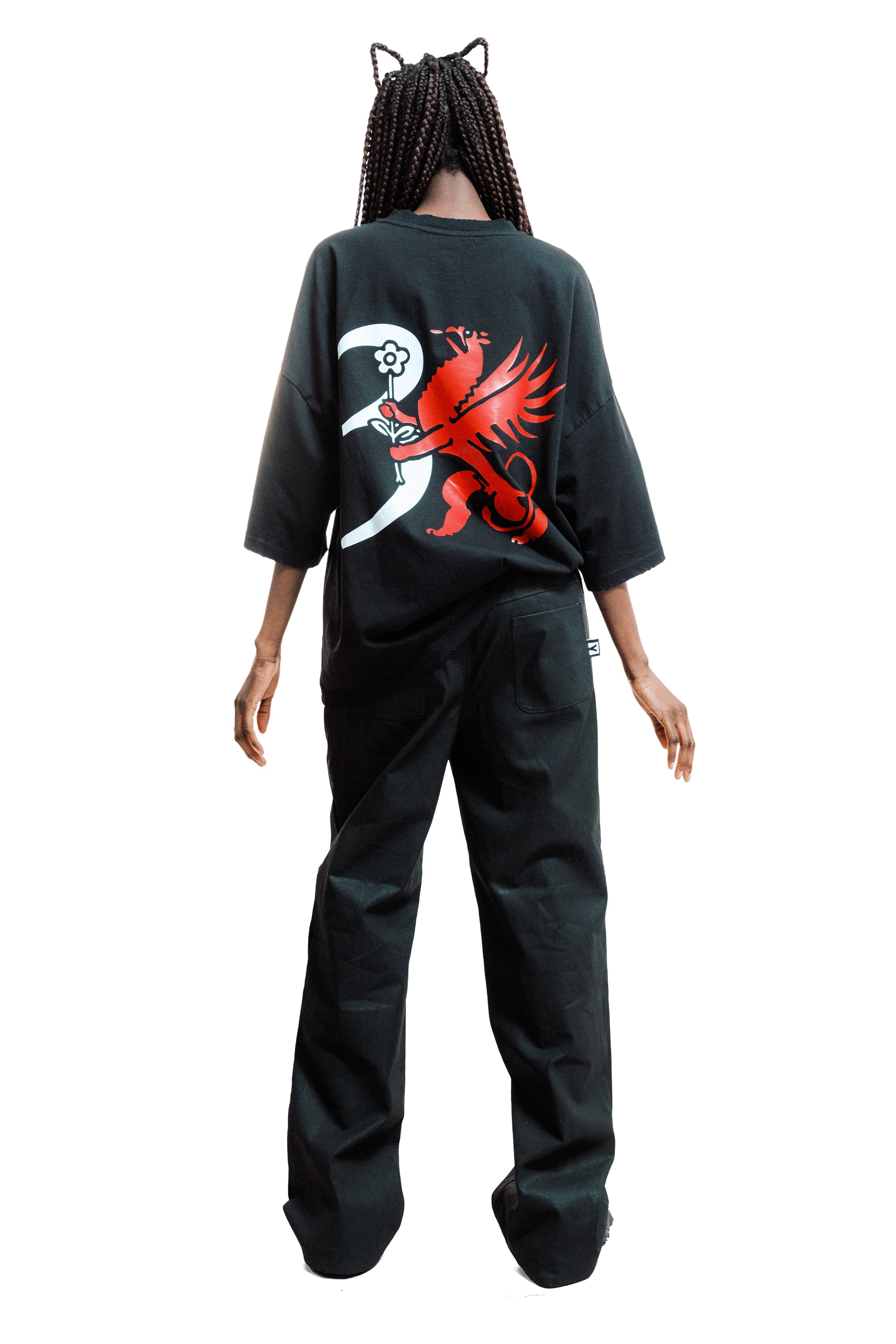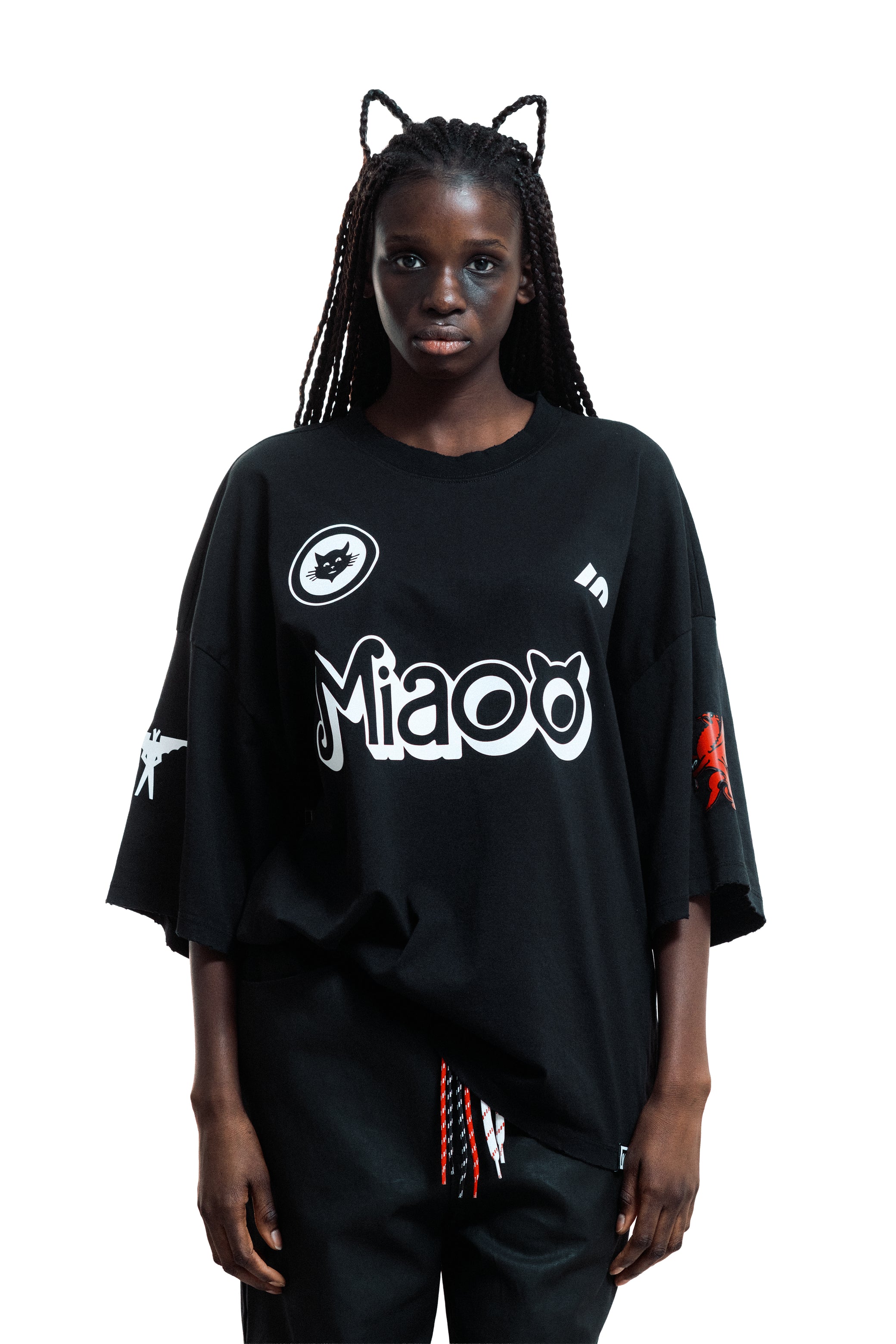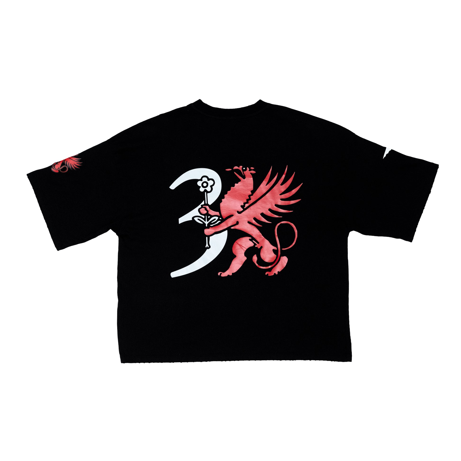 Oversized t-shirt in 100% cotton, black color, with worn edges on sleeves and hem achieved through an erosion technique. Features a 3D transfer print on the front as a tribute to the cats living freely in the city. Flat transfer print on the back with the perfect number and a griffin. The sleeves showcase the Milanese devil and the Biscione with a flower.